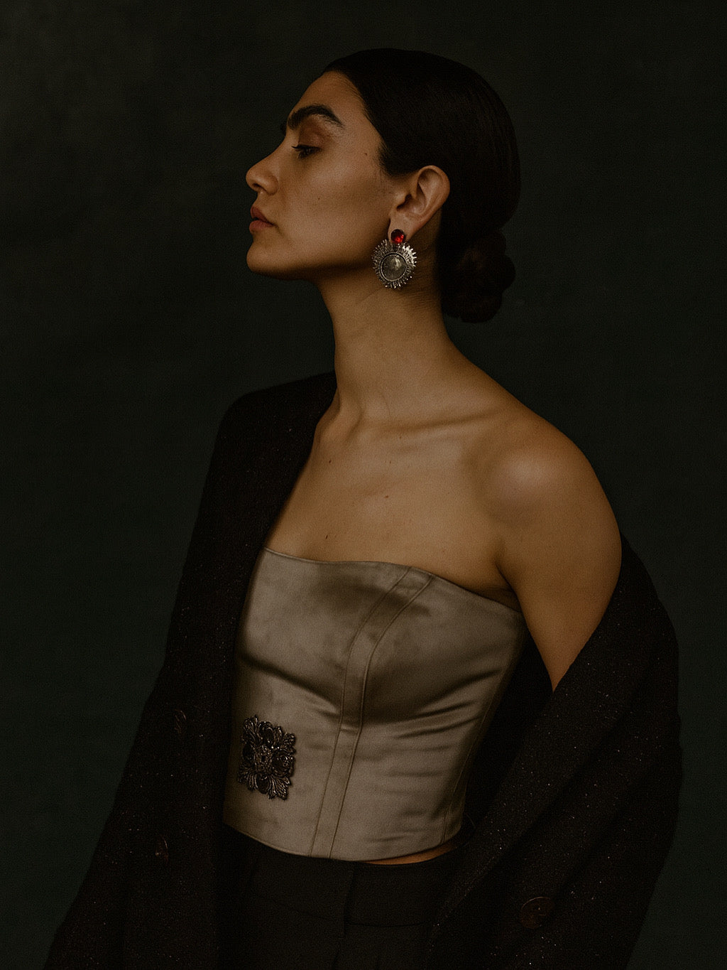 A couture statement, this handmade velvet bustier is adorned with a jeweled floral medallion of luminous moonstone-like gems and intricate metallic detailing. Its sculpted silhouette channels timeless elegance, while the embellishment captures the light with every movement — a fusion of artisanal craftsmanship and Dior-inspired sophistication. Designed by Noor Arash, this piece embodies exclusivity, grace, and modern femininity